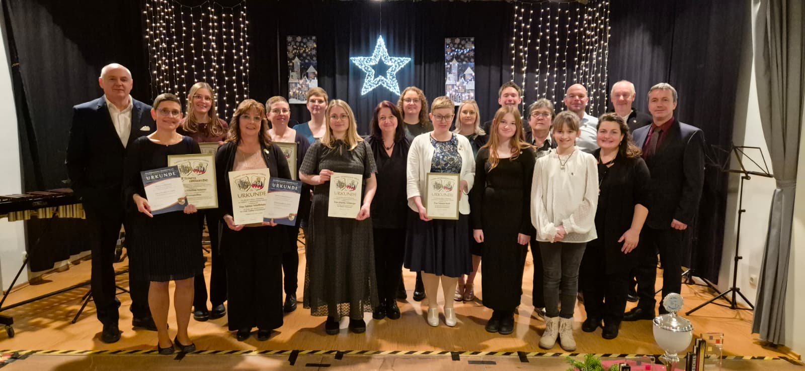 Die Weihnachtsfeier bietet immer einen besonderen Rahmen für die Ehrungen der aktiven Mitglieder. Es erhielten für ihren ersten Auftritt in diesem Jahr Felicitas Daschner, Sofia Firenze, Levin Kell und Matthias Klebrig die grüne Vereinsnadel. Die bronzene Vereinsnadel erhielten Jessica Dümpert und Jakob Werner für 10 Jahre aktives Musizieren im Verein und im Nordbayerischen Musikbund (NBMB). Für 20 Jahre erhielten Wilhelm Ehrlinger, Dominic Johanni und Henning Thunrey die silberne Ehrennadeln. Markus Hellfeier durfte sich über die goldene Vereinsnadel und das silberne Abzeichen des NBMB für 25 Jahre freuen. Thomas Höche wurde für 30 jähriges aktives Musizieren im Verein mit dem großen bronzenem Abzeichen zum Ehrenspielmann ernannt. Ihr 40 jähriges Jubiläum feierten Petra Emes und Martina Gräf und bekamen das große silberne Vereinsabzeichen sowie die goldene Ehrennadel im NBMB. Besonders stolz sind die Spielleute auf ihren Jubilar Jürgen Korn. Ihm wurde das große goldene Vereinsabzeichen sowie die goldene Ehrennadel des NBMB verliehen. Seine 50 jährige Laufbahn im Spielmannszug startete er auf der Flöte bevor es ihn zu den Fanfaren zog. Außerdem war er an allen Wertungsspielen in diesen 50 Jahren beteiligt und verhalf dem Verein somit zu seinen Erfolgen. Der Landesverband der Fahnenschwinger zeichnete Andrea Urbanski und Dominic Johanni für sieben mit dem bronzenen bzw. 15 Jahre mit dem silbernen Kranz aus.